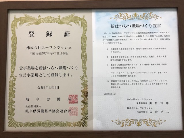 岐阜労働局様より「新はつらつ職場づくり宣言事業場」として登録認定されました。