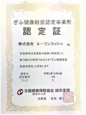 全国健康保険協会 岐阜支部様より「ぎふ健康経営認定事業所」Sランクの認定を戴きました。脳ドック・心臓ドック・インフルエンザ予防接種・健康診断の全額会社負担、従業員の健康課題の把握と対策、職場のコミュニケーション向上の行事等々の内容が認められました。